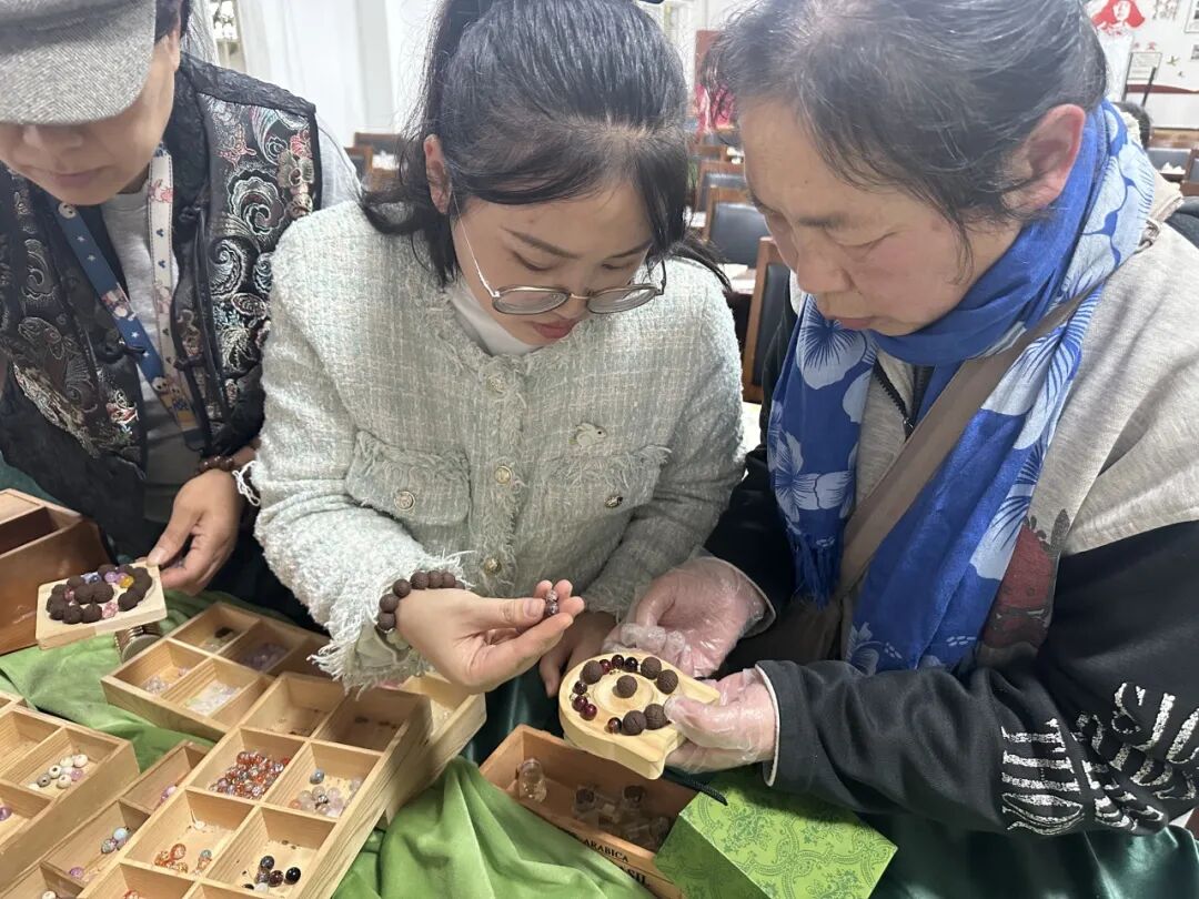 本次活动紧扣重阳节敬老爱老的文化内涵,巧妙融合“天府银龄”老年志愿服务精神,设计了别开生面的“中药养生手串DIY”体验环节。活动伊始,现场便洋溢着温馨祥和的气氛。在志愿者的耐心指导和协助下,老人们兴致盎然地挑选着散发着自然药香的中药材颗粒,仔细辨别其养生功效,相互交流搭配心得,亲手将一颗颗承载着健康祝福的药材串连起来。穿珠、引线、打结……每一步都凝聚着对美好生活的热爱与期盼。不一会儿,一条条独一无二、寓意安康的养生手串便在老人们的巧手中诞生。大家纷纷将自己的劳动成果佩戴在腕间,脸上绽放出满足与自豪的笑容,不仅将健康平安“戴”在了手上,更将温暖情意留在了心间。