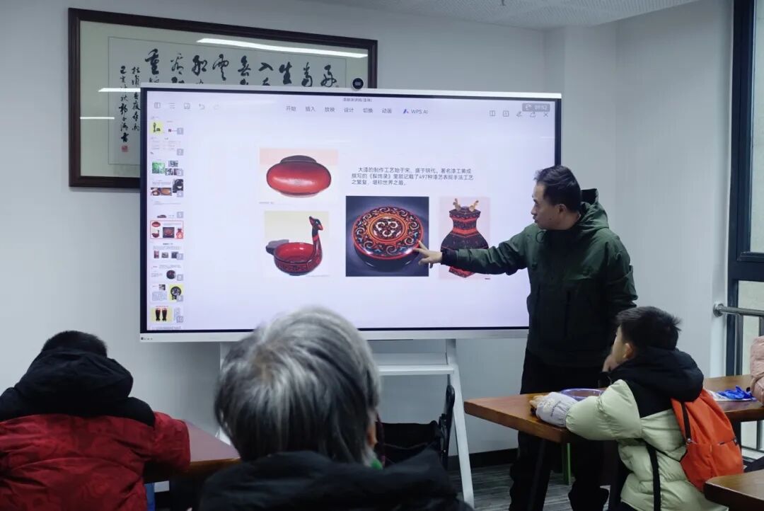 活动特邀成都漆器代表性传承人郑恩主讲授课。郑恩深耕漆艺设计与制作二十余年,兼具深厚的理论积淀与丰富的实操经验。现场,他从成都漆器始于商周、盛于汉唐的悠久历史讲起,生动阐释了漆器的起源与发展脉络,详细介绍了大漆作为核心制作材料的特性,拆解了“雕嵌填彩”“堆漆工艺”等特色技法的精髓,并讲解了漆器在古今生活中的多元用途,让体验者深刻领略到这项国家级非遗项目的文化底蕴。